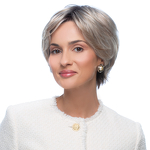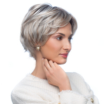Modelka w białej bluzce prezentuje perukę Beryl w kolorze 23/66/4R.