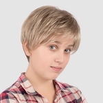 Model Nele to peruka dziecięca z włosów syntetycznych utkanych na bazie, którą charakteryzuje wykonanie maszynowe na tresach oraz mikroskóra na linii przedziałka. Specjalne włókno syntetyczne doskonale imituje prawdziwe włosy.