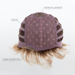 Model Tabu to peruka z włosów syntetycznych o podwyższonej odporności na ciepło utkanych na bazie, którą charakteryzuje wykonanie maszynowe na tresach, mikroskóra na czubku głowy oraz mini linia rozmyta z przodu. Specjalne włókno syntetyczne doskonale imituje prawdziwe włosy.