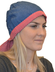 Dwustronny turban imitacja jeansu z czerwoną troczką w białe kropki IZA 4-2*