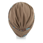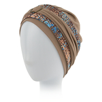 Czepek jest przewiewny i doskonale sprawdzi się w roli samodzielnego nakrycia głowy. Można go uzupełnić o jedną z dwóch opasek, aby nadać unikalnego charakteru swojej stylizacji. Dzięki temu turban będzie pasować do wielu okazji. Jedna opaska to stonowane zestawienie kolorów, natomiast wykończenie drugiej to abstrakcyjne wzory, które kontrastują z gładką czapeczką.