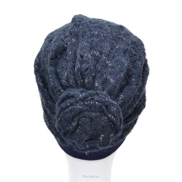 Elementem ozdobnym turbanu jest udrapowana z tyłu róża, do której prowadzą łagodne drapowania. Turban wygląda elegancko, jest wygodny i wprost idealny do codziennego użytku.